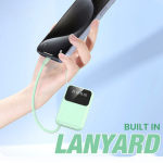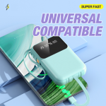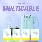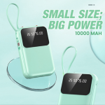 10,000mAh power bank with 4 built-in cables, 1 USB port (2.1A fast charge), 2 LED torch lights, and a compact, vibrant design.
