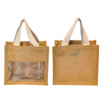 A laminated jute window bag is an eco-friendly, reusable bag made primarily of jute fiber and has a laminated surface for added durability and protection. These bags often feature a clear window panel, allowing visibility of the contents inside. They are popular for packaging gifts, groceries, and other items due to their strength, sustainability, and aesthetic appeal. The jute material provides a natural look, while the lamination enhances the bag’s resistance to moisture and wear.